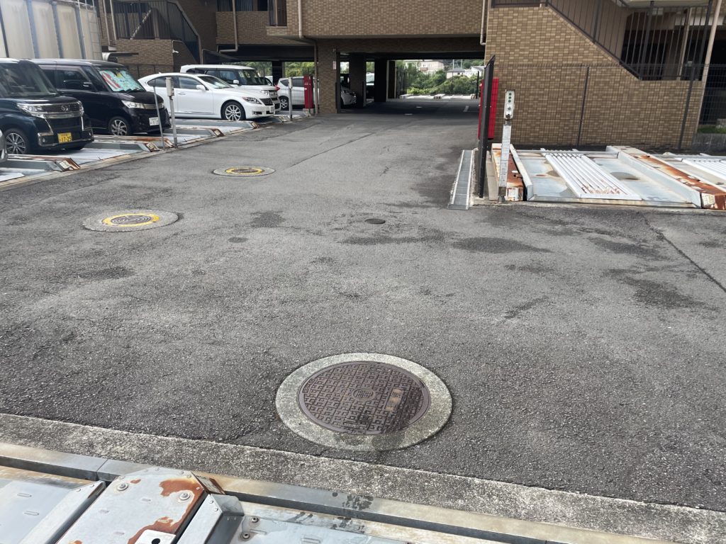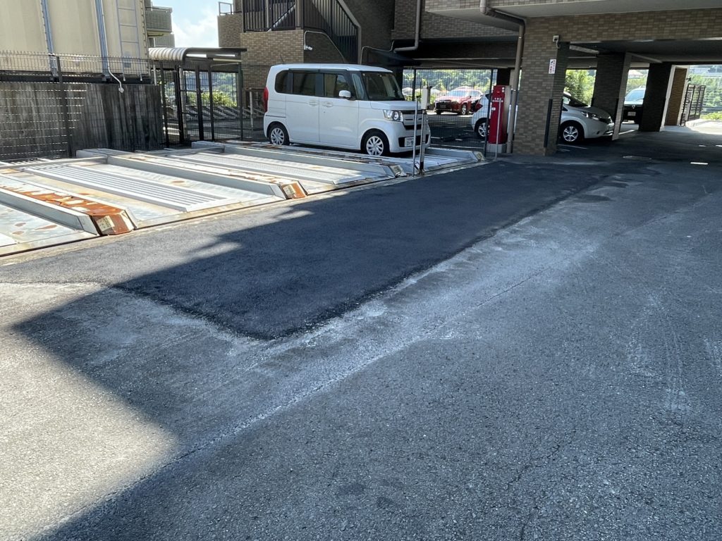 既存駐車場の傷んでいる部分をオーバーレイで部分補修しています。